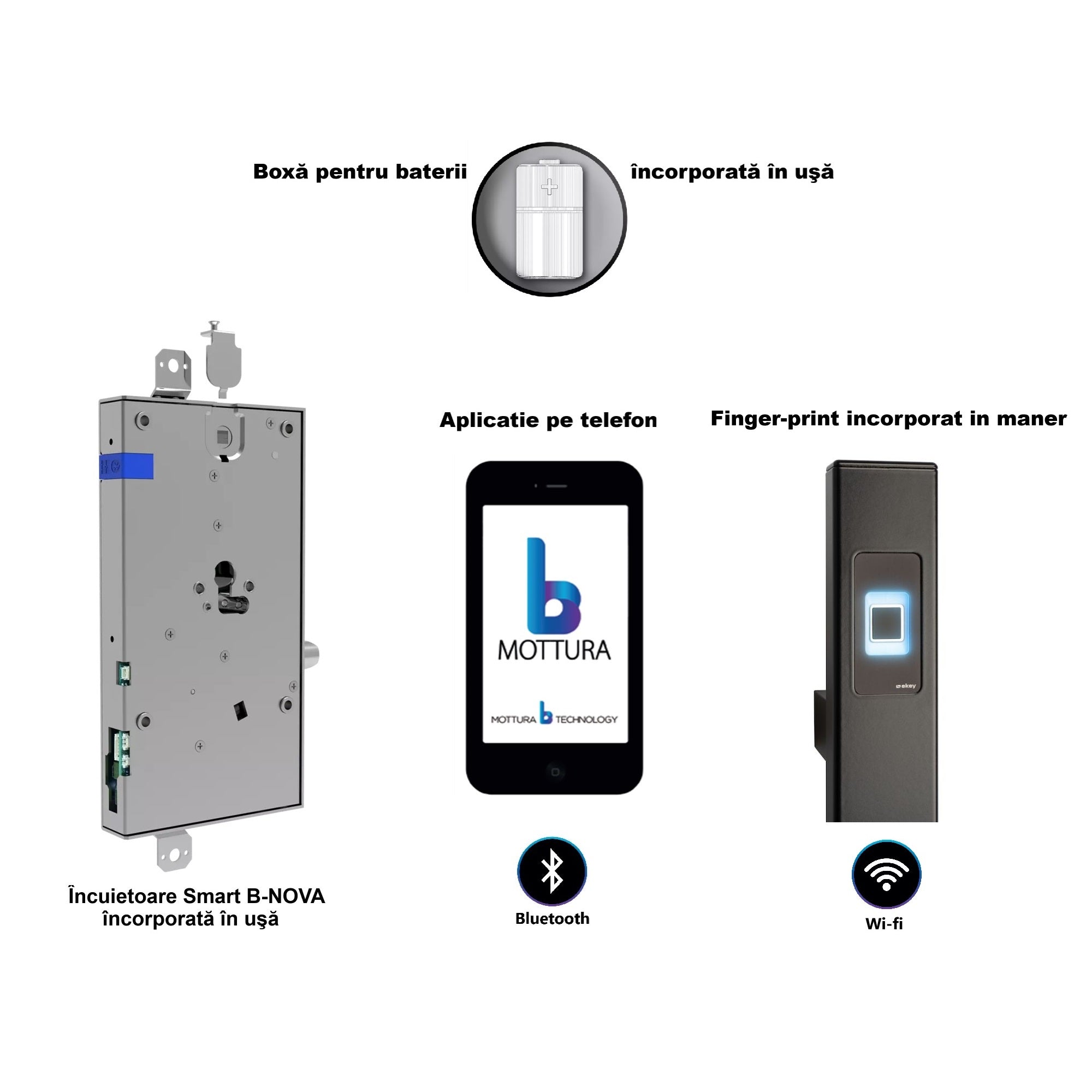 Setul principal Securemme, se inlocuieste cu un set Mottura B-NOVA, care este unul motorizat si are o conexiune prin Bluetooth 5.0 cu telefonul tau, folosind o aplicatie mobila dedicata + control de la distanta prin routerul wi-fi + cititor de amprente incorporat în mânerul tip bară.