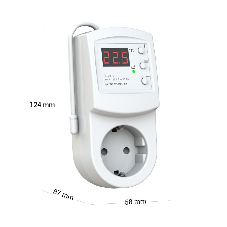 Acest Termostat de ambient tip priza Terneo RZ are rolul de a seta temperatura dorita a panourilor radiante. Dispozitul este simplu de folosit, panourile radiante se conecteaza la termostat, iar acesta se conecteaza la priza. Termostatul se va opri atunci cand in ambient se va atinge temperatura dorita. Odata cu acesta se va opri, evident, si panoul radiant. Daca temperatura din incapere scade, acesta va reporni.